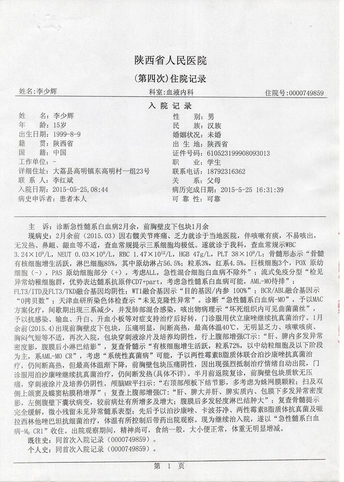 2015年6月23日三秦都市报记者杨晶讲:大荔白血病患者15岁学生李少辉急需社会各界救助。